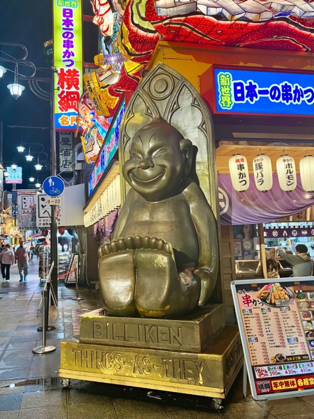 (写真は大阪のシンボルとして愛されているビリケンさんです。通天閣の近くで撮りました。この新世界のあたりは、たくさんの串かつ屋さんで賑わっています。串かつの元祖といわれる創業昭和4年の「串かつだるま」さんにて食事をしましたが、メニューにあるQRコードを読み込むと、自分のスマートフォンからすべてのオーダーができる仕組みとなっていてとても便利です。なんだかその現代的な感じと、昔ながらの店内の様子との間にギャップがあって面白かったです。もちろん串かつはどれも絶品でした)