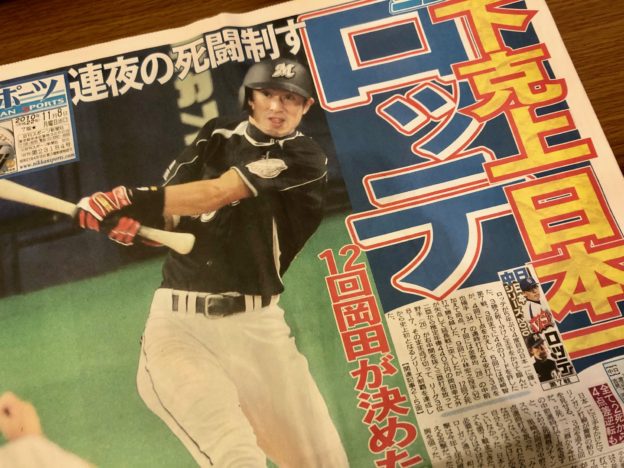 (写真の新聞は2010年、岡田選手が打ったタイムリーヒットが決勝打となり、ロッテが日本シリーズで優勝した時のものです)