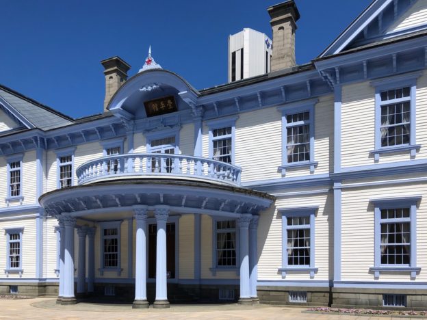 (写真は札幌の中島公園内にある「豊平館」です。明治時代に開拓使が建てた洋造ホテルです。白とウルトラマリンブルーを基調としたカラーリングが、北海道の爽やかな夏の青空に映えています)